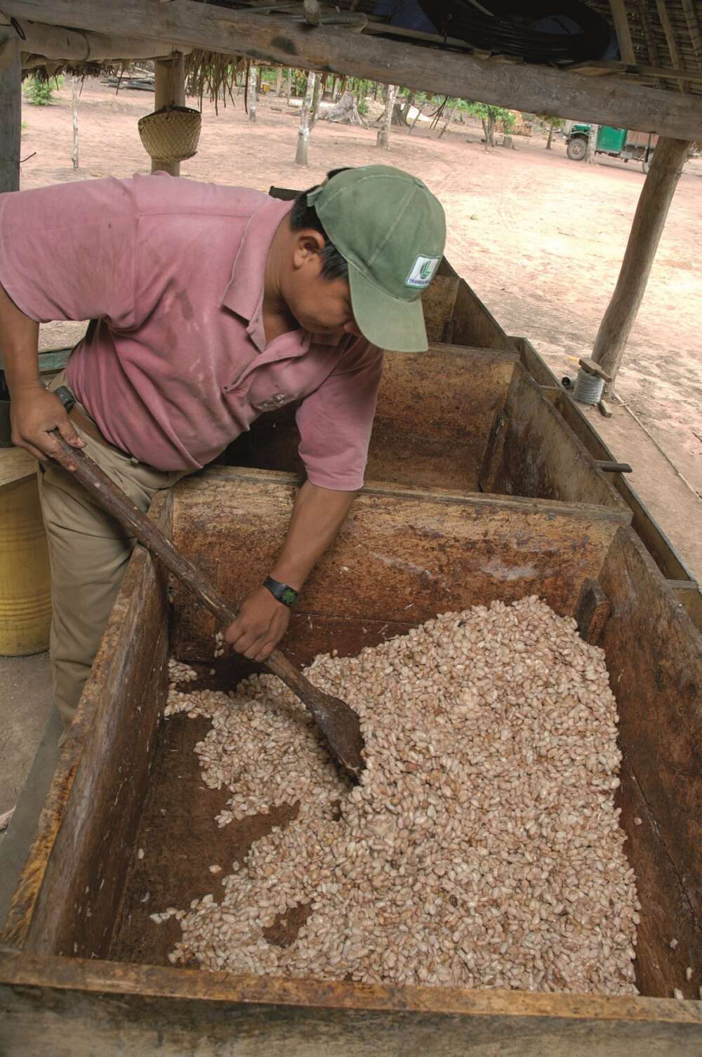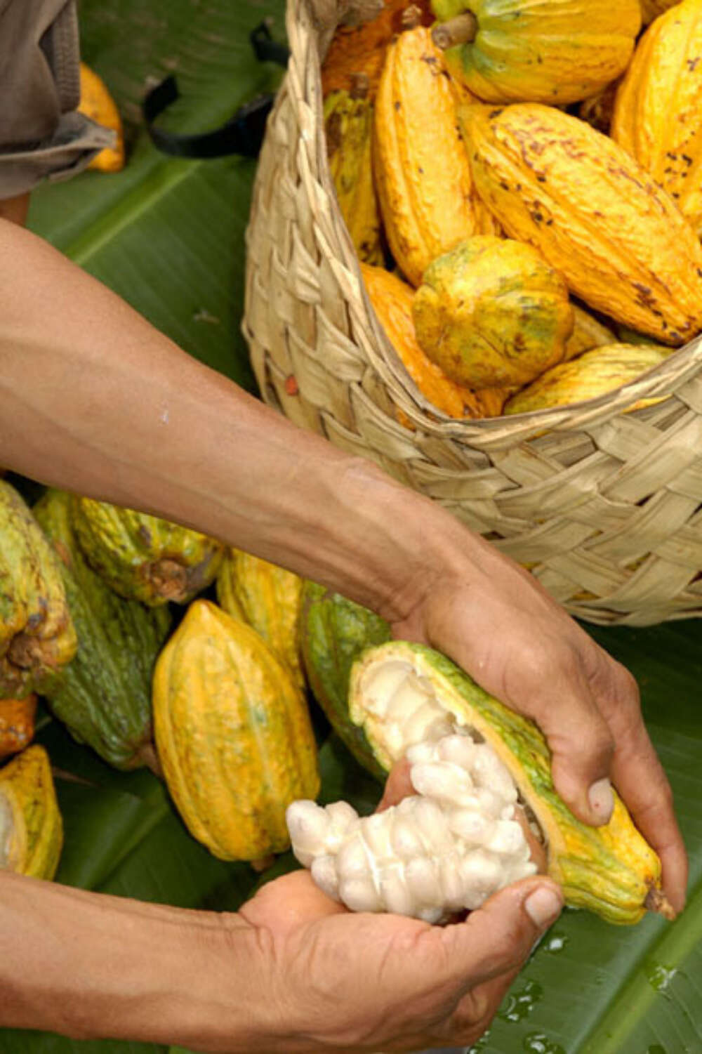 Am Ende der Regenzeit ist die Cacaofrucht reif und die Ernte beginnt. Sehr sorgfältig trennt der Bauer mit Hilfe eines scharfen Messers die reifen Früchte vom Baum. Dabei achtet er darauf, den Stamm, die Blüten und die unreifen Früchte nicht zu verletzen. Die geernteten Früchte werden aufgeschnitten, die Kerne und das Fruchtfleisch aus der Schale entfernt.