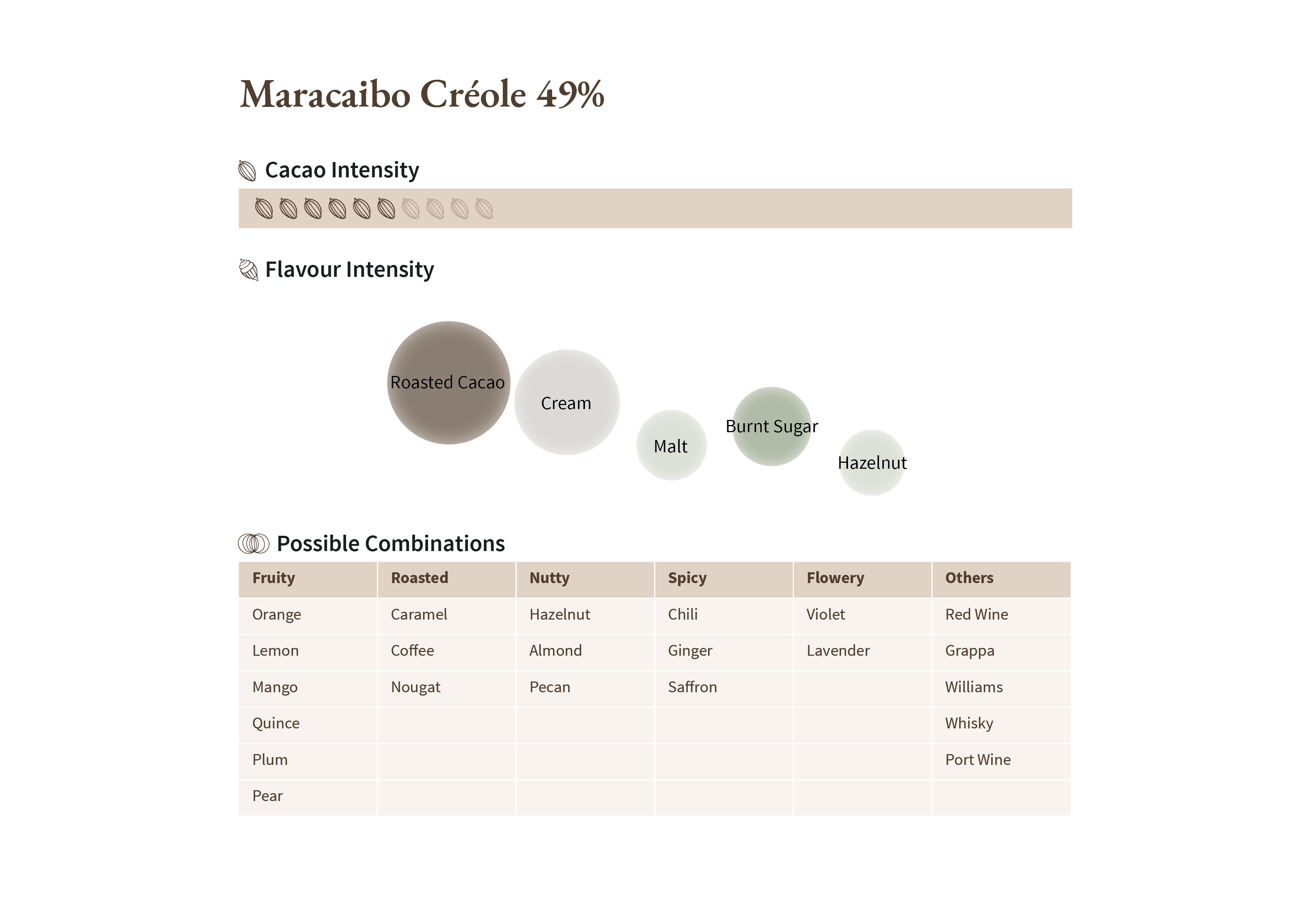 Maracaibo Créole captivates with its velvety texture and delicate notes of cream. The traditionally gentle processing brings out the light aroma of caramelised sugar and a hint of hazelnut and malt. Its complex and well-harmonised cacao notes transition into a long-lasting, exceptionally fine melt.