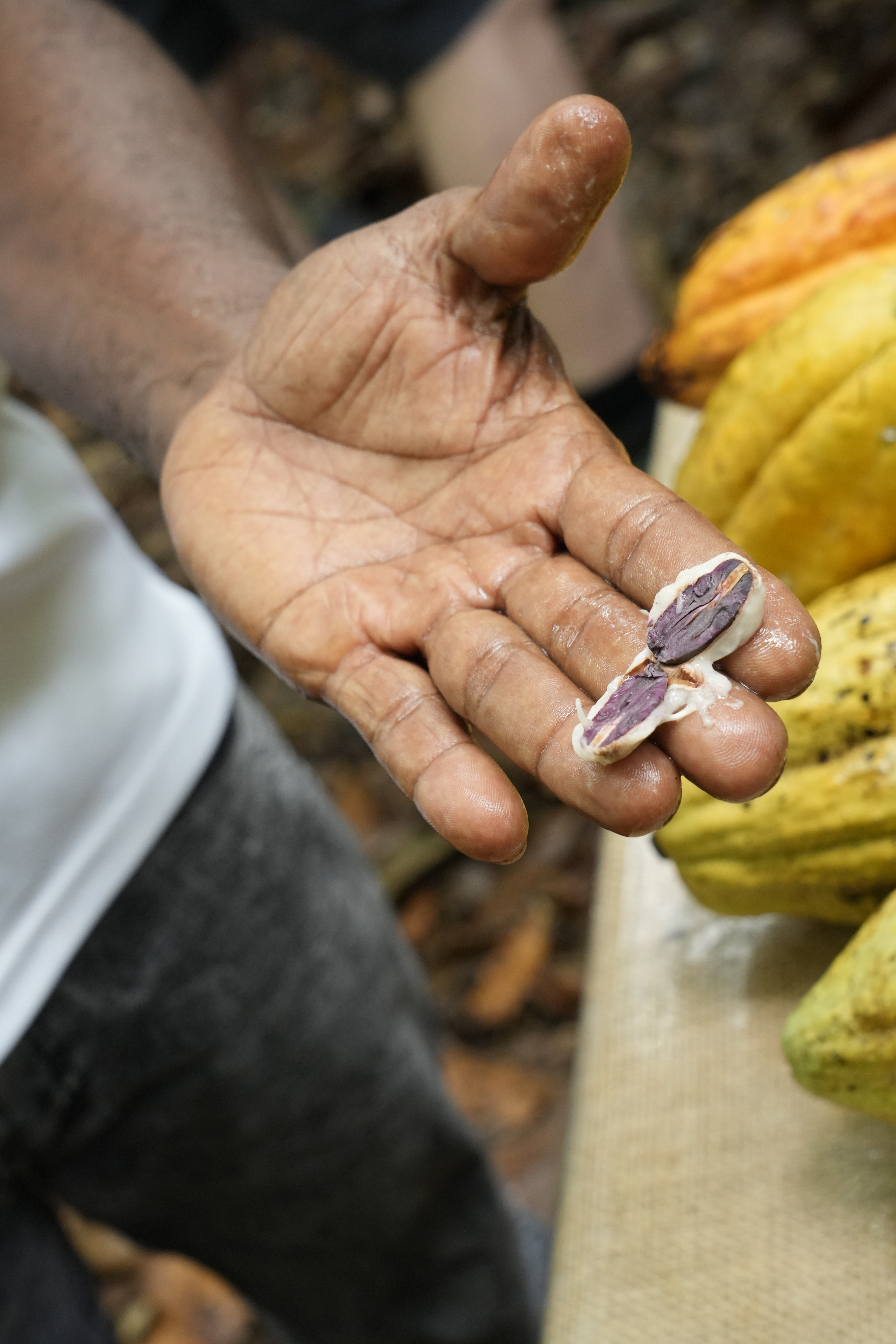 Ces influences se perçoivent déjà dans la pulpe du fruit de cacao frais, qui présente un fruité prononcé et complexe. La forte proportion de pulpe ainsi que la diversité des arômes ne sont donc pas seulement un gage de qualité, mais aussi le résultat direct de ces systèmes de culture biodiversifiés.