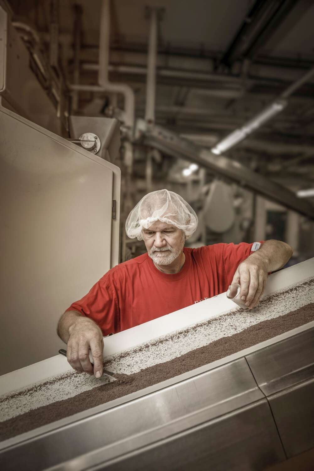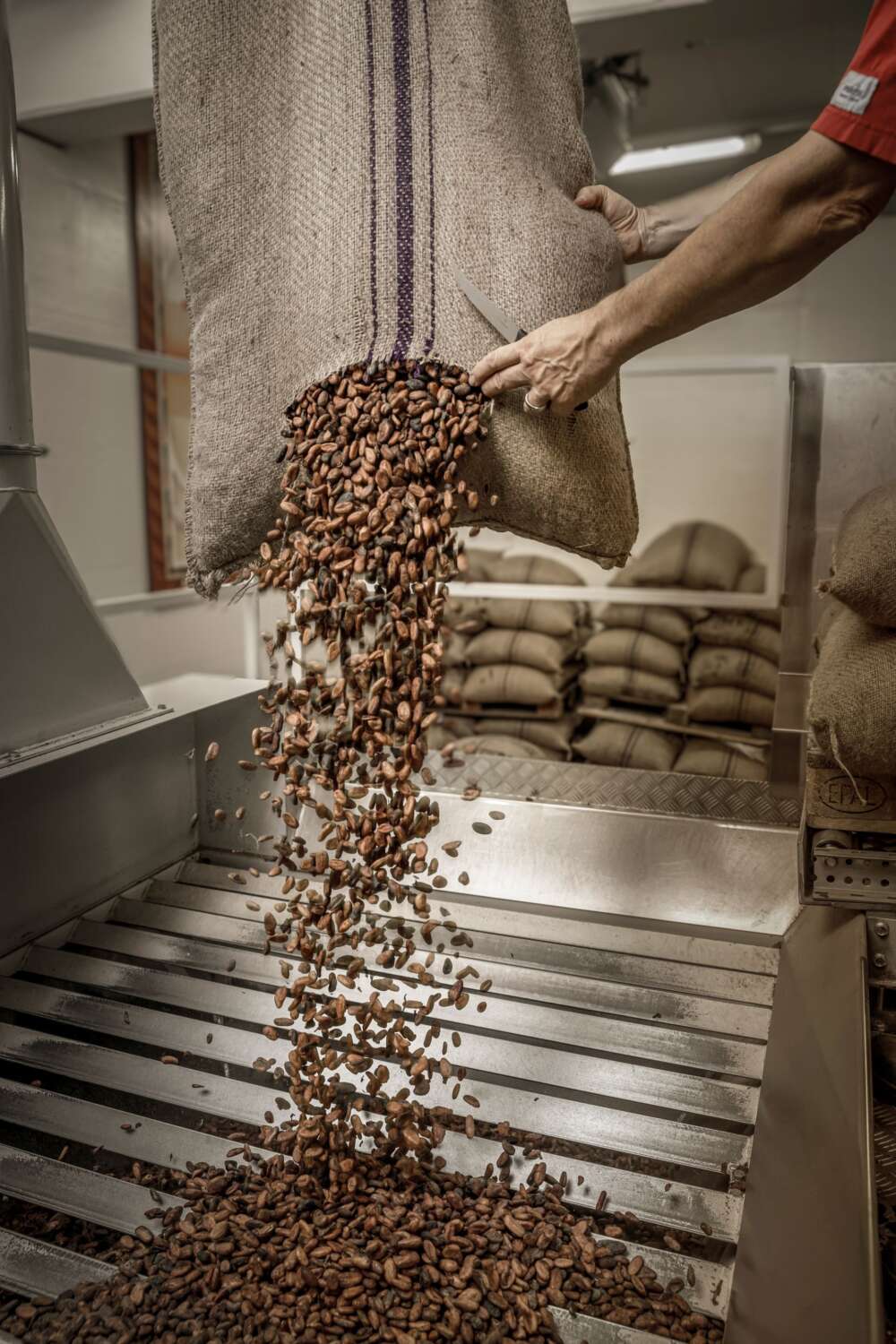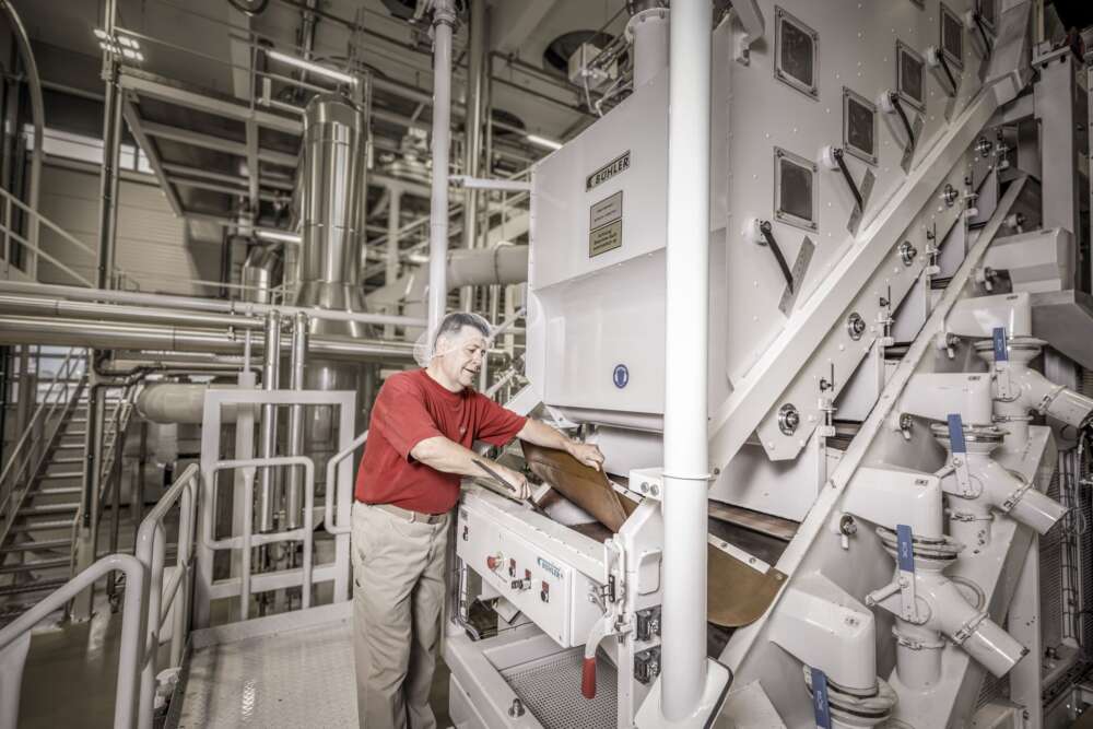 Les fèves refroidies sont ensuite transportées vers le concasseur, où elles sont broyées en morceaux et où les parties de la coque sont séparées. Dans le moulin triple, les grains concassés sont ensuite broyés à une finesse de 25 à 30 micro en utilisant les trois meules. Ensuite, de petites billes en céramique de 150 kg traitent la masse dans le broyeur à billes et réduisent à nouveau sa finesse à environ 15 à 20 micromètres.