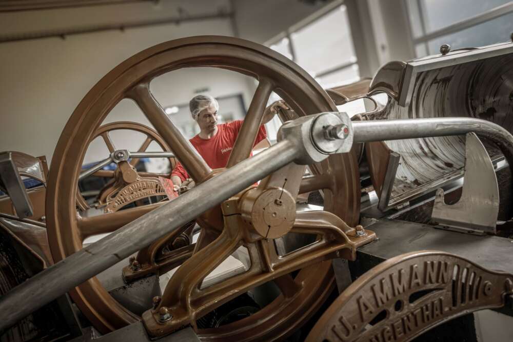 La méthode traditionnelle de conchage en conche longitudinale fait ressortir au mieux les arômes du cacao par des heures de mouvement et d’aération. Le conchage peut prendre jusqu’à 72 heures et est déterminé par les caractéristiques de la fève et de la recette. Le lent échauffement du chocolat met peu à peu en valeur les arômes délicats.